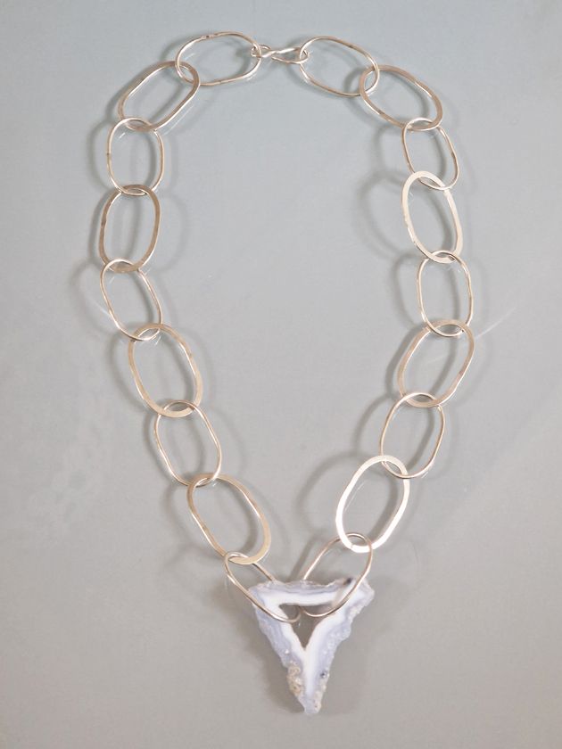 Solid sterling silver handmade chain with a feature blue agate pendant. The necklace is approximately 55cm long, although can be worn shorter using the hook fastening. The necklace is hallmarked.