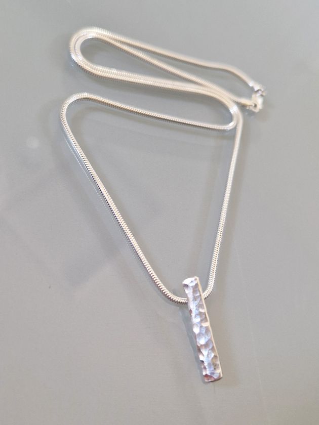 Solid sterling silver pendant with a hammered and poished finish hung on a solid silver snake chain available in 16, 18 or 20 inch lengths. The pendant is approximately 2.3cm long.